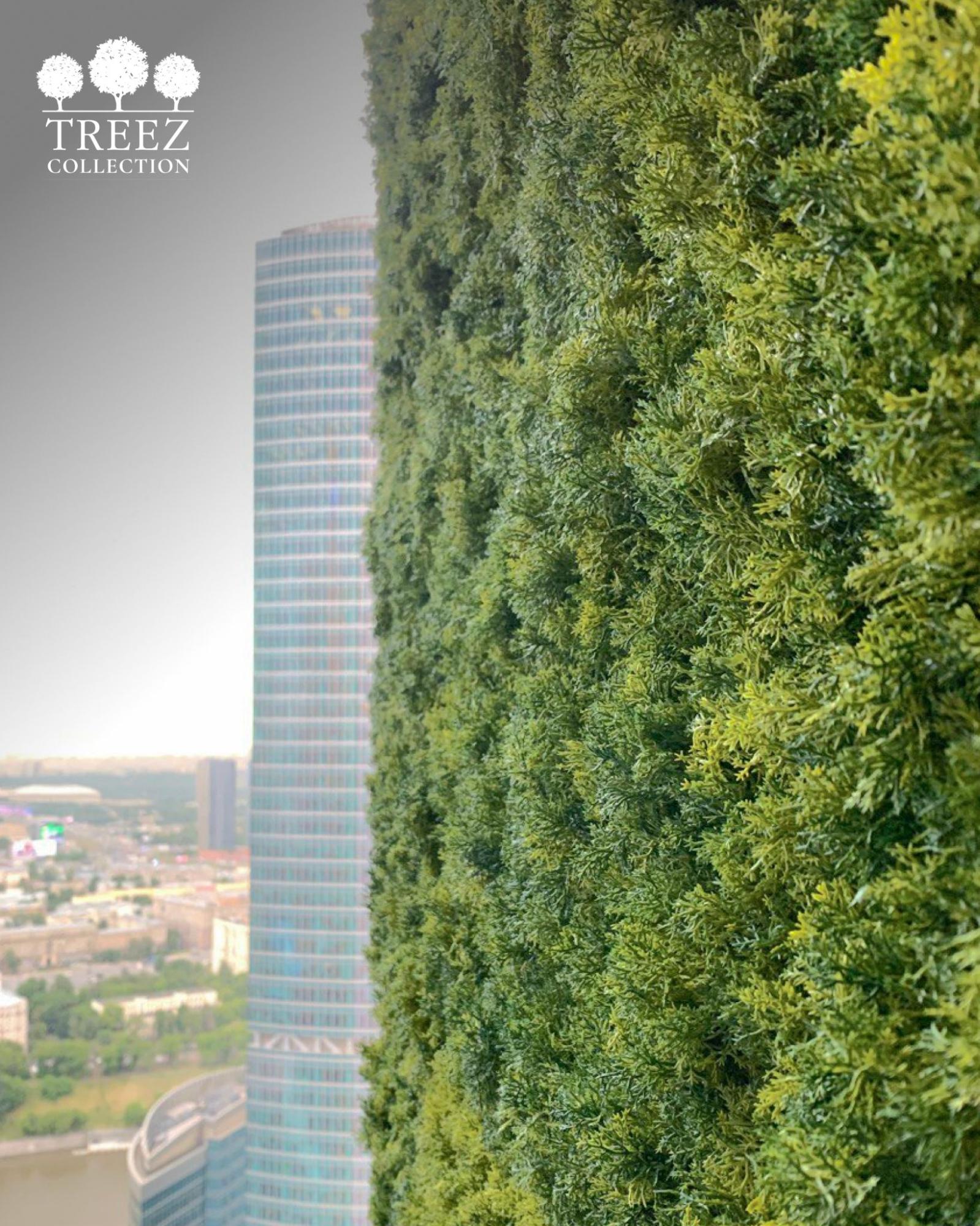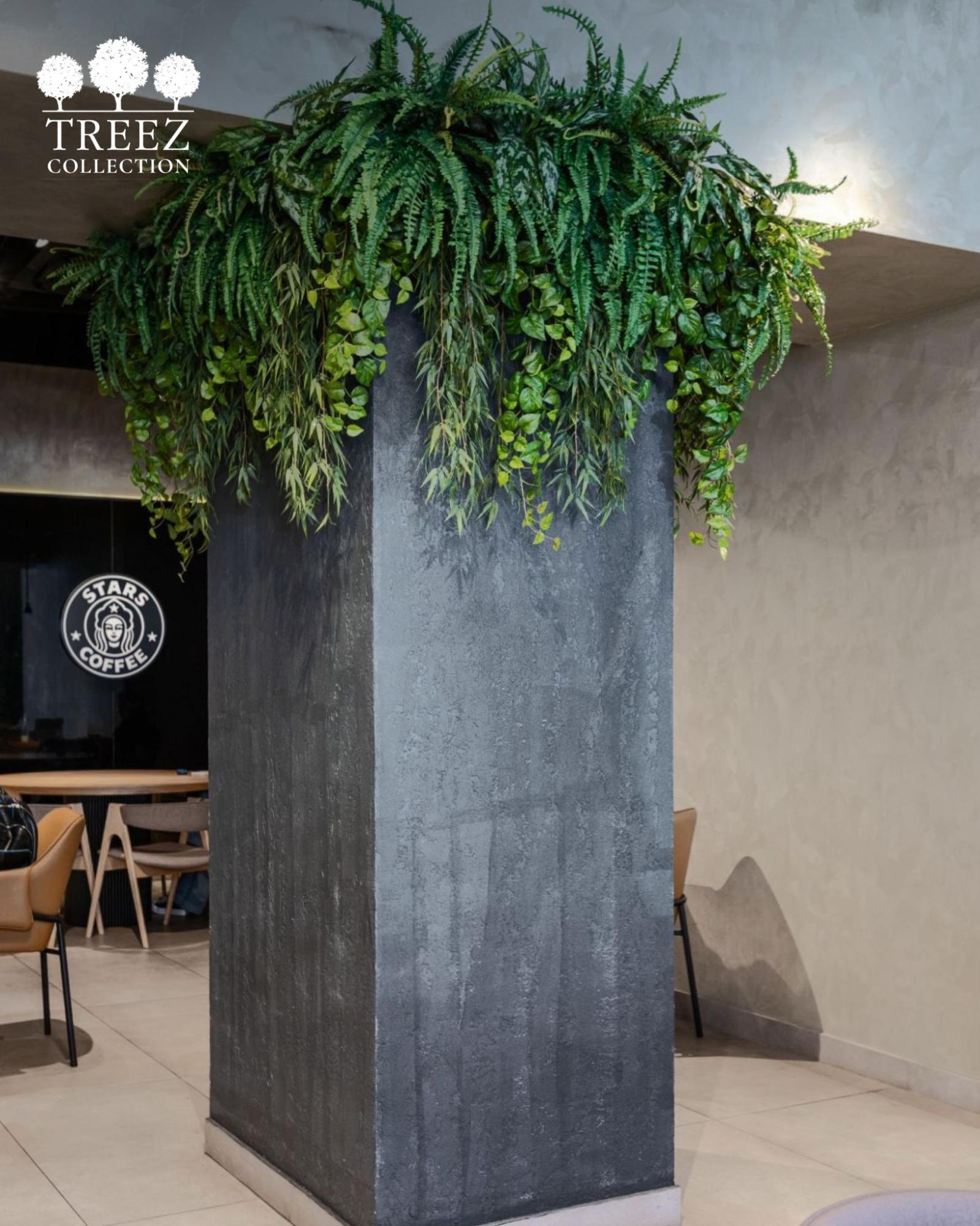 Вертикальные конструкции из дерева или металла, масштабные, различных форм, «заросшие» группами средних и небольших растений с разной фактурой, размером и рисунком листьев, напоминающие заросшие скалы, ущелья у водопадов или покрытые мхами и папоротниками стволы деревьев в тропических лесах. Например, фитостены или объемные конструкции, увитые искусственными ампельными растениями.