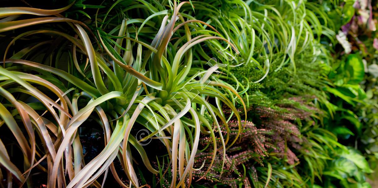 Фитопанно. При создании вертикального озеленения тилландсия разбавит более плотную зелень, сделает композицию фактурнее и визуально интереснее.