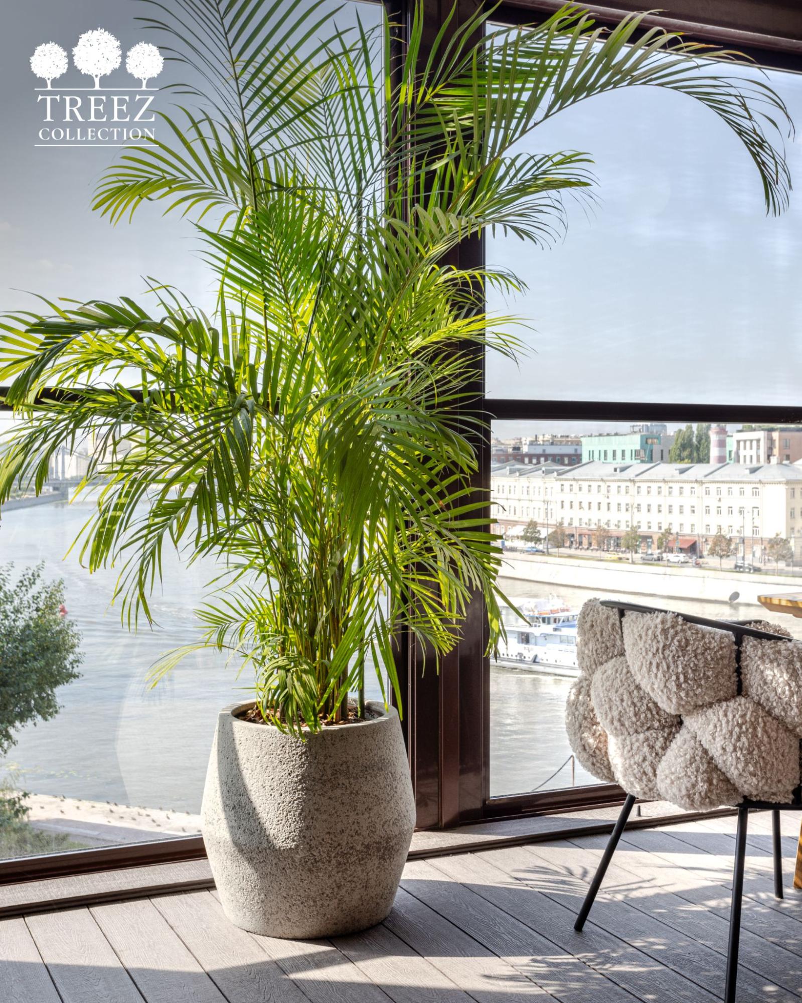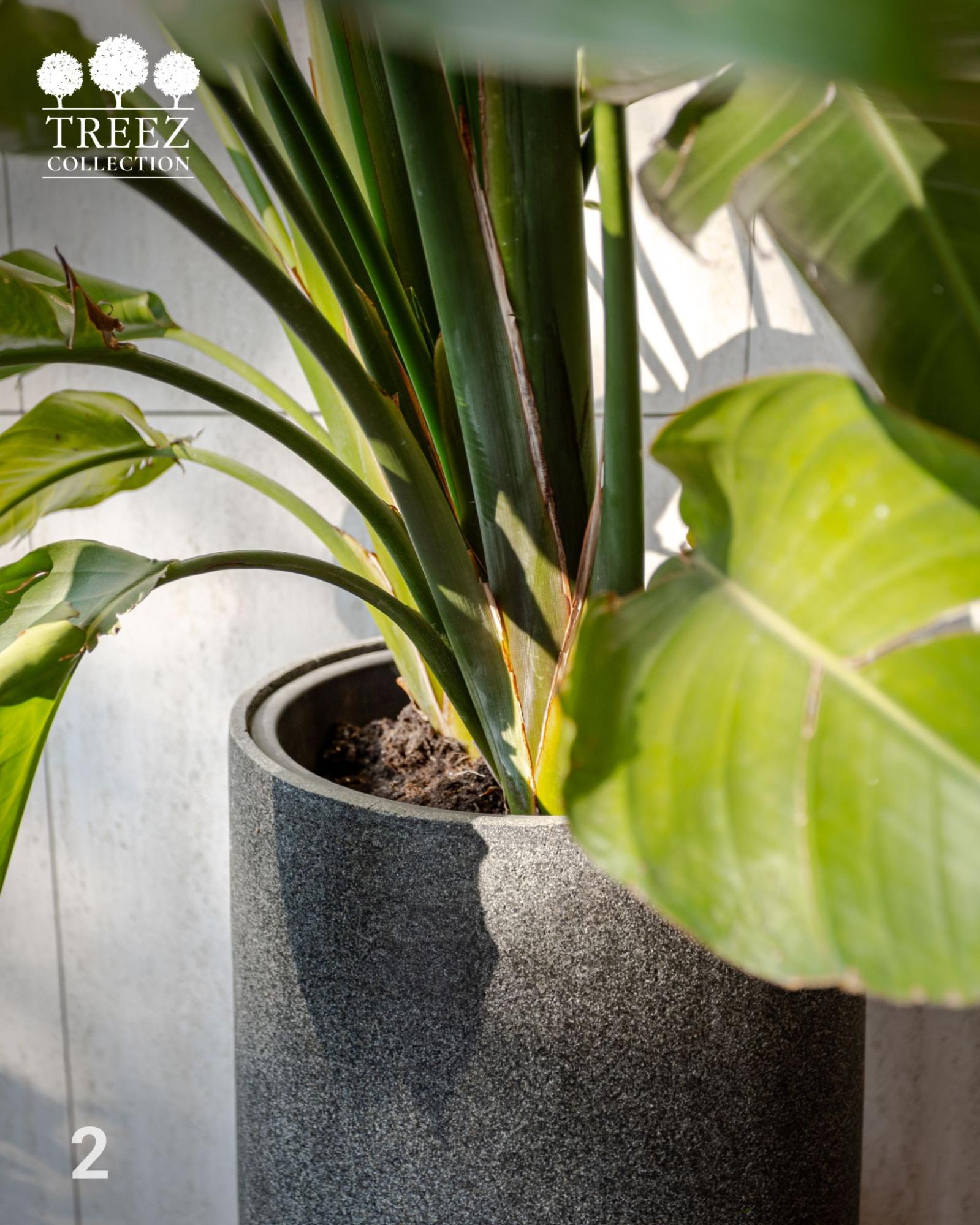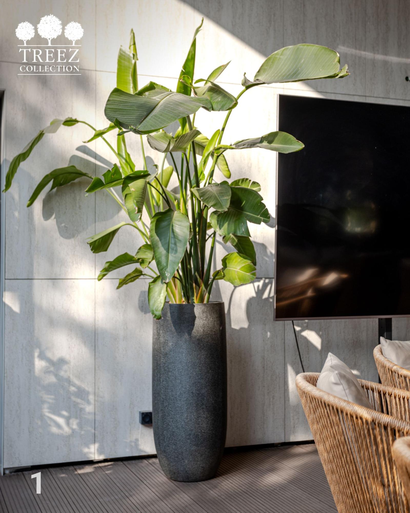 Черешки стрелиции перекликаются по цвету с тканью обивки кресел, а рисунок прожилок на листьях напоминает линейный узор плетёных поверхностей. Средне-тёмный серый цвет кашпо сглаживает резкий тоновой контраст между чёрным экраном и светло-серой стеной. А общий тон растения и пола — почти одинаковый по степени темноты — вносит дополнительную мягкость и баланс. Фактура кашпо под камень отзывается в рельефе стены, создавая ещё одну точку визуального сопряжения.