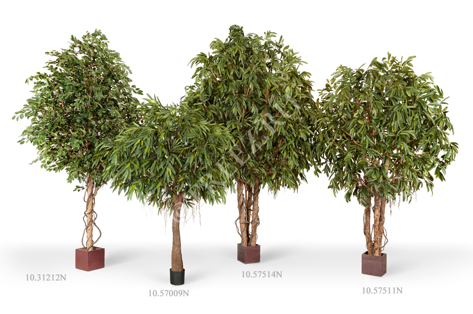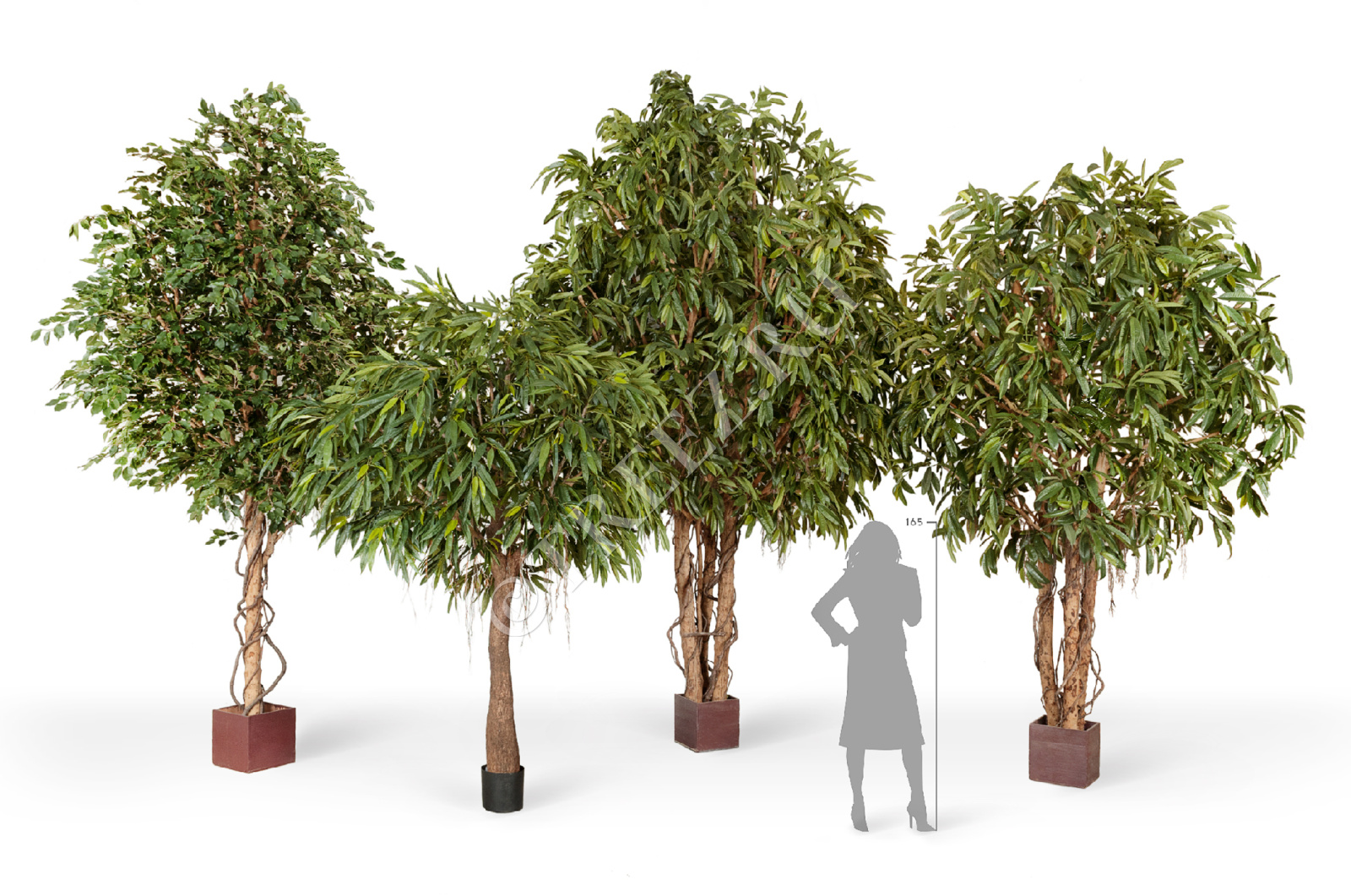 Размеры: высота вместе с кашпо - 330 см, диаметр кроны - 220 см, высота ствола от верха горшка до первой ветки - 100 см, диаметр стволов от 7 до 9 см, ширина расположения стволов 35 см.