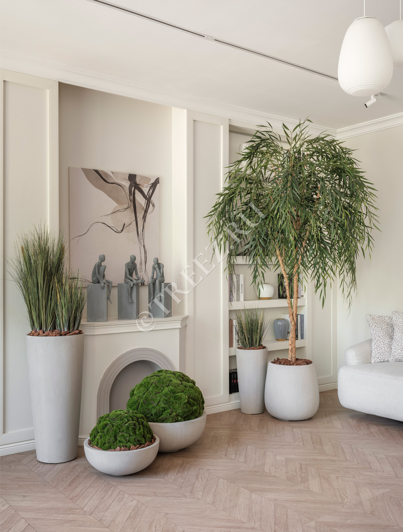 Сет № 43 - Композиция с Ивой и Шарами из Мха в кашпо Treez Effectory Beton Белый песок